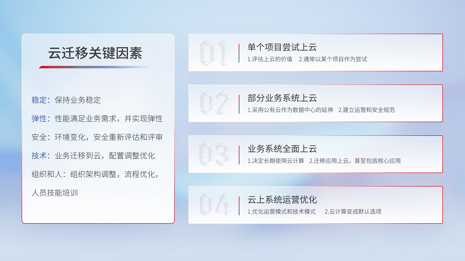 结合实际业务,,,,从规划设计、、、、云平台选型、、、云原生改造、、、数据迁移、、集成交付,,迁移全过程为客户识别最佳上云路径,,,做好风险识别管理,,,,设计网络架构、、、身份权限、、、安全审计合规、、操作审计、、、、日志审计、、、、监控告警策略、、多站点容灾设计等,,,对云上基础设施进行整体规划,,,,提升IT治理水平,,以满足弹性、、、高可用、、、、高性能的需求。。。。