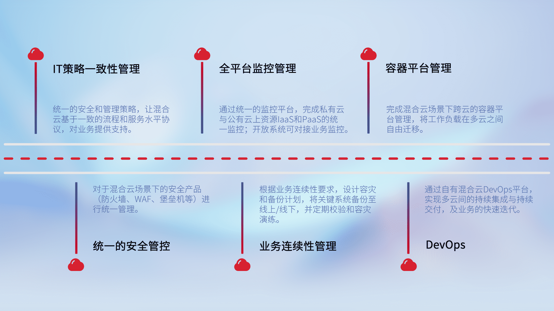 通过多云纳管,,,以统一的资源数据模型把客户的云资源进行抽象和封装,,进而实现对多云资源的统一操作,,,保障云资源管理的可靠性、、稳定性与可用性。。。。量身定制化运维内容,,配置、、开发运维、、、补丁管理、、、备份、、、监控、、、认证和访问管理、、、审计和日常巡检等,,保障在用云过程中的可靠度,,稳定度以及高可用率。。。