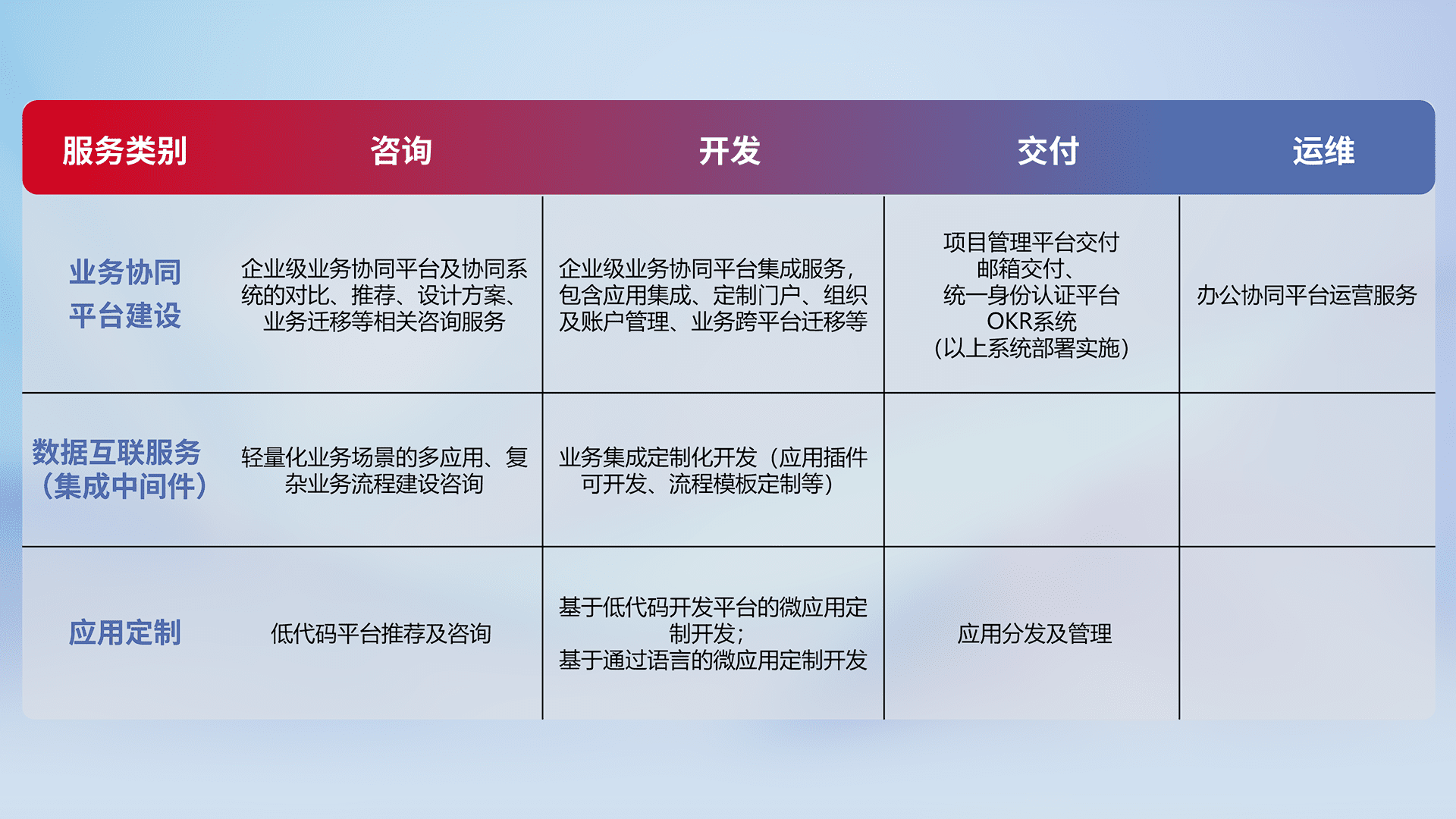 针对钉钉、、、、企微、、IDaas等平台级产品提供产品的规划、、方案、、交付、、、、定制化开发等服务,,,实现如统一协同办公、、、智能客户服务、、、、混合会议管理、、智能数据查询、、等业务场景,,,,实现数字化转型。。。